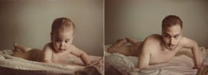 [Für meine sehbehinderten Leser: Das Bild zeigt links einen nackten Säugling, der in typischer Babyfoto-Manier bäuchlings auf einer Decke liegt. Rechts räkelt sich ein erwachsener Mann auf der Decke … ebenfalls nackt und bäuchlings, aber vollbärtig und mit demselben angestrengten Gesichtsausdruck wie das Baby, das er mal war.]