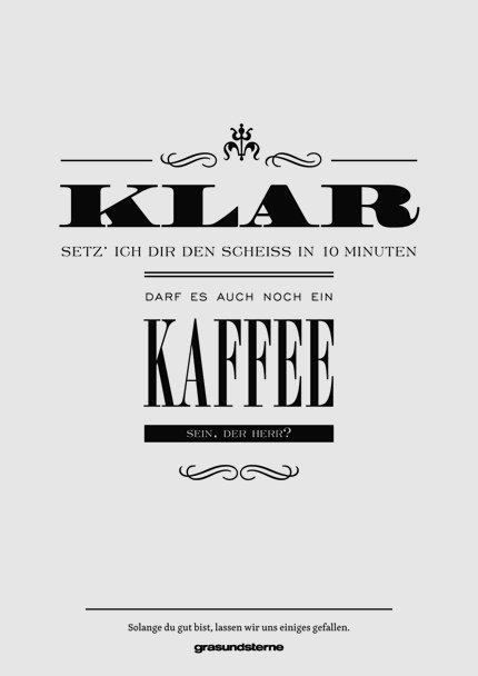 [Für meine sehbehinderten Leser: Hier steht, hübsch schnörkelig gesetzt, der unausgesprochene, aber oft gedachte Grafikerfluch “KLAR setz’ ich Dir den Scheiß in 10 Minuten – Darf es auch noch ein Kaffee sein, der Herr?”]
