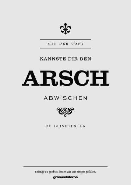 [Für meine sehbehinderten Leser: Hier steht, typographisch ebenso hübsch aufbereitet und wirklich très charmant: “Mit der Copy kannste Dir den ARSCH abwischen, Du Blindtexter”]