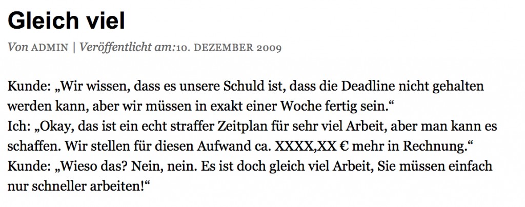 Dass der Kunde nicht gesagt hat, du brauchst weniger Stunden, deshalb sollte es ja eher billiger sein, ist auch nur ein Wunder, oder?