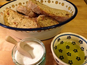 Wir, also der Gatte, der Turbosohn, die Liebreizende und ich, genießen diesen Ausbund an Tomatigkeit und Kräuterwürze zunächst ungesalzen. Salz steht nämlich, genau wie ein Schüsselchen des wunderbarsten Olivenöls, immer auf dem Tisch. Ins Öl (wir erinnern uns: das beste!) tunken wir frische Ciabatta, krümeln einige Salzkristalle drauf und beißen nach jedem Löffel Suppe davon ab. Okay, man kann die Suppe auch direkt salzen und Roggenbrot dazu essen, aber wir machen es eben so. 🙂