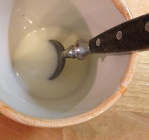 Hat das Süppchen also weniger als 15 Minuten geblubbert, rührt man die Speisestärke in einem Pfützchen kalten (!) Wassers an und kippt dieses am Ende des Köchelns in die Suppe. Einmal noch aufkochen lassen, etwas Pfeffer frisch reinmahlen – und fertig.