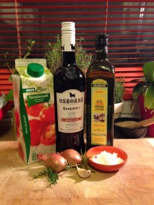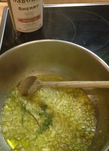 Der Sherry im Bildhintergrund steht da übrigens nicht zur Deko, der wartet auf seinen Einsatz. Selbiger ist gekommen, wenn die Zwiebelchen gaaanz glasig, aber noch nicht braun geworden sind. ZISSSCHHHH! löscht ein reichlicher Schuss Sherry das Geschmurgel und bremst die Bräunungssession von Zwiebeln & Co. ein. Nun darf die Sache weitere 3 Minuten einkochen. Immer mal umrühren! (Kleiner Exkurs: Es ist ein Gerücht, dass der Alkohol von Kochwein und seinen Kumpels völlig verdampft; ein bisschen bleibt immer drin. Wenn Ihr also für alkoholkranke Menschen oder Kleinstkinder kocht, ersetzt bitte alle alkoholhaltigen Zutaten z.B. durch Gemüsebrühe. Prioritäten, you know?)