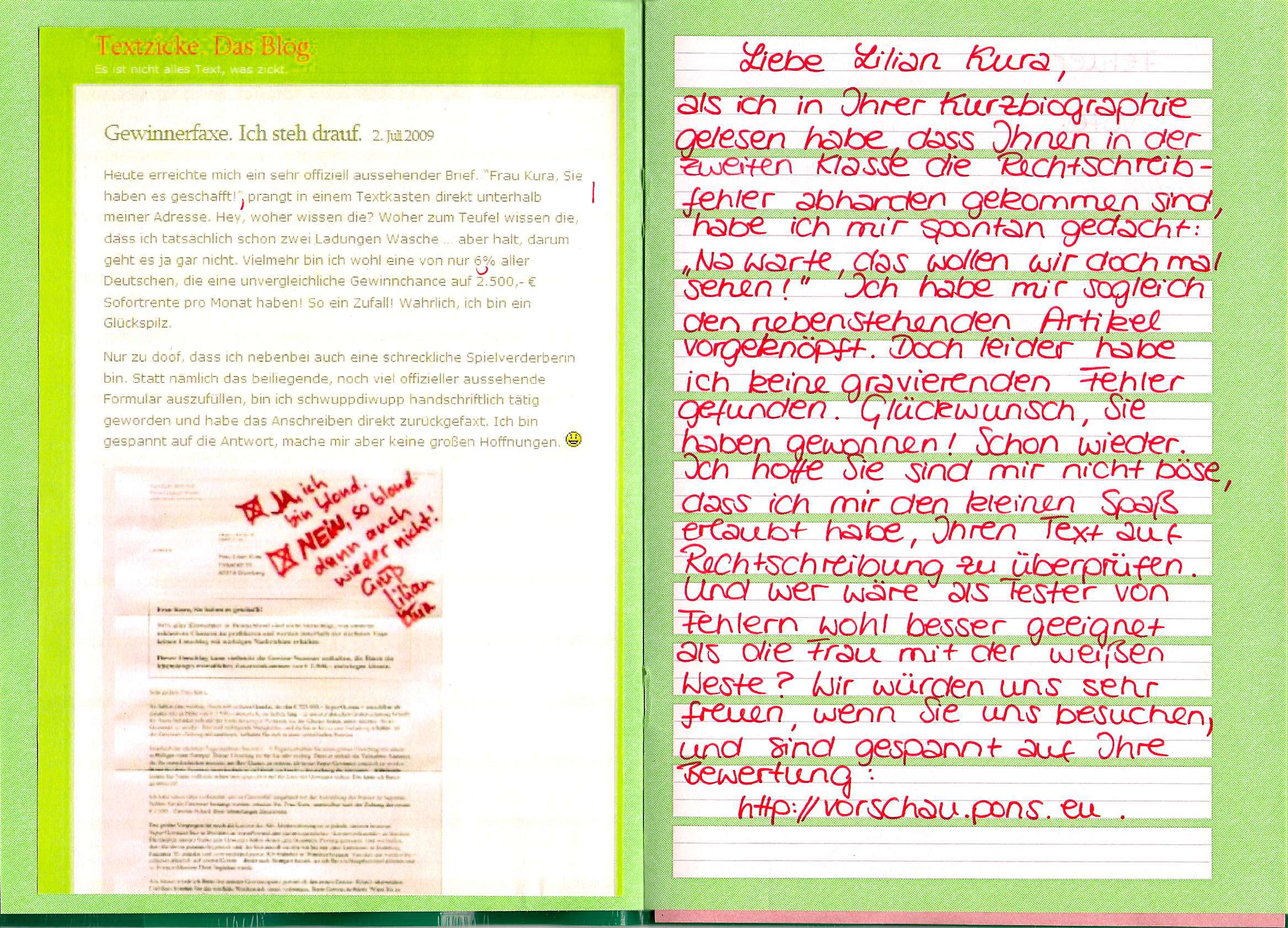 Frau Pelzer von PONS nahm sich meinen Artikel “Gewinnerfaxe. Ich steh drauf.” vor, fand ein fehlendes Komma (klingt absurd, ich weiß *g*) nach schließendem Anführungszeichen und hätte gern einen Leerschritt zwischen Zahl und Prozentzeichen gesehen.