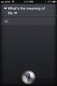 [Für meine sehbehinderten Leser: Das Bild zeigt einen iPhone-Screenshot, wie er durch eine Anfrage bei Siri entsteht. Die Frage lautet “What’s the meaning of life?” und Siri antwortet “42”. Wer “Per Anhalter durch die Galaxis” von Douglas Adams gelesen hat, findet das großartig.]