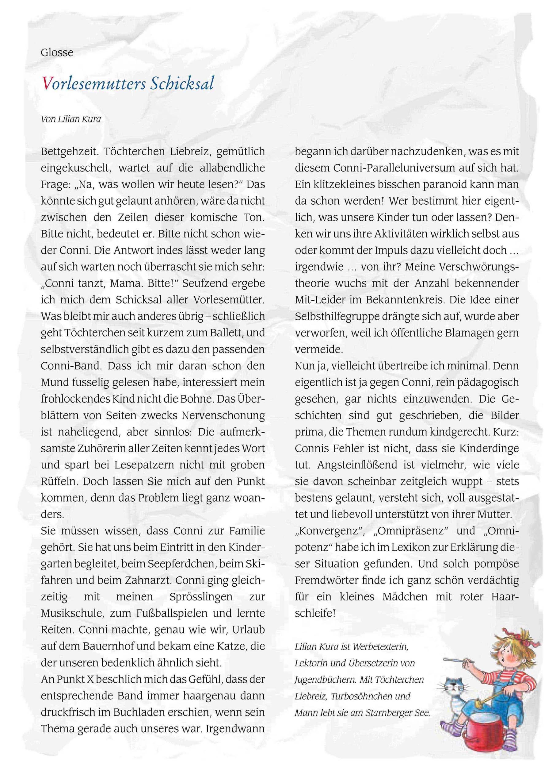 Nein, ich bin kein allzu großer Fan von Conni. Wirklich nicht. Das heißt – ich habe nicht pauschal etwas gegen das Gör mit der roten Schleife, aber zu viel ist zu viel. Mitte 2009 hatte ich das große Glück, für den Carlsen Verlag (Herausgeber der Conni-Bücher) eine Glosse genau zu diesem Thema schreiben zu dürfen. Sie erschien in einem Sonderheft, das seit Kurzem in den Buchhandlungen zum Mitnehmen ausliegt.