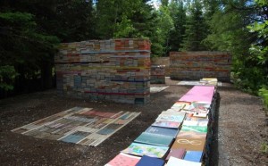 Das und Ähnliches ging mir mir beim Vorbeisurfen an diesem Projekt bei lilligreen.de durch den Kopf. Ein “Bücherwald” in Quebec, Kanada? Was zum Teufel sollte ich mir darunter vorstellen? Es war dann doch nicht das, was ich gedacht hatte. Eigentlich würde der Begriff “Waldbibliothek” für diese Installation besser passen. Denn hier haben die beiden Künstler Thilo Folkerts (Landschaftsarchitektur) und Rodney Latourelle im Rahmen eines Gartenfestivals schlicht aus alten Büchern Teile einer Bibliothek gebaut. Dass die aufgestapelten Alt-Werke mit der Zeit zerfallen werden, nehmen sie in Kauf. Vergänglichkeit eben.