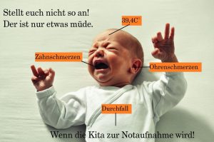 Ich bin wahrlich keine Mutter, die ihre Brut bei jedem Kinkerlitz zuhause behalten hätte. Aber Fieber, bellender Husten, grüner Rotz, heftiger Durchfall, Erbrechen oder totale Schlappheit SIND KEIN ZUSTAND, IN DEM MAN EIN KLEINKIND IN DIE KITA BRINGT!