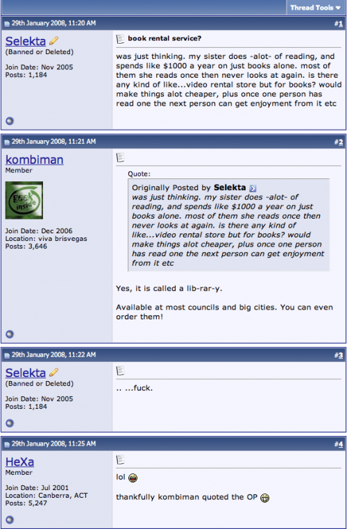 [Für meine sehbehinderten Leser: Hier sieht man ein typisches Fenster aus einem Frage-und-Antwort-Forum mit der, naja, lieb gemeinten Frage eines Users namens Selekta: “my sister does a lot of reading and spends like a $ 1000 a year on just books alone. Most of them she reads once then never looks at again. Is there any kind of … like video rental store but for books? Would make things a lot cheaper, plus once one person has read one the next person can get enjoyment from it etc.” – Sehr schön darauf die Antwort des Users kombiman: “Yes, it is called a lib-ra-ry. Available in most councils and big cities. You can even order them!”]