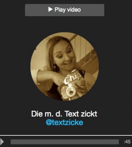 Ach, wie ist das nett! Ein neues, in meinen Augen hochkreatives (und technisch echt cooles) Tool wabert aktuell durch Twitter. Vizify analysiert Tweets, getwitterte Fotos und Tweetverhalten – Twitter”hochzeiten”, häufigste Gesprächspartner, typische Schlagworte – und bastelt daraus ein Video. Man kann, muss aber nicht, einzelne Szenen nachträglich löschen, austauschen oder neue hinzufügen. Auch die Musikauswahl ist veränderbar. Bei mir kam ein Filmchen dabei heraus, das mein Alter Ego Textzicke gar prächtig umschreibt. Finde ich. 🙂