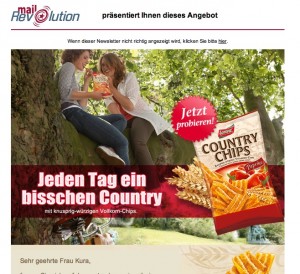 Warum ich das blogge? Ich habe heute zwei eMails desselben Inhalts bekommen. Zielgruppe: leider verfehlt. Ich möge doch diese komische neue, ja gar gesunde (!) und vollkörnige Ausgeburt der Knabberindustrie probieren, schreibt man da: