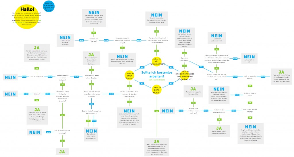 Die Antwort, so wird mir der geneigte Leser zustimmen, lautet vernünftigerweise meist “Natürlich NICHT, hallo, geht’s noch?”. Trotzdem gerät man als Freelancer immer wieder in die Situation, den vermeintlichen guten Argumenten potenzieller Leistungserschleicher begegnen zu müssen. Auch mir ist es – vor allem in den ersten Jahren meiner Freiberuflichkeit – durchaus schon passiert, dass ich mich von blumigen Versprechen und dreisten Lügen einlullen ließ. Für diese Fälle hat die amerikanische Typo-Künstlerin und Illustratorin Jessica Hische die Mindmap “Should I work for free?” erstellt. Schritt für Schritt führt sie den gezwickmühlten Freelancer durch die  Entscheidungsfindung, ob man angeblich ruhmreiche, folgeauftragsschwere und karmafördernde Projekte ohne Honorar bearbeiten sollte. Fazit: Solange der/die Anfragende nicht Deine Mutter, Dein bester Freund oder eine coole Band oder Non-profit-Organisation ist, mit deren Zielen Du Dich 100% identifizierst: lass es!