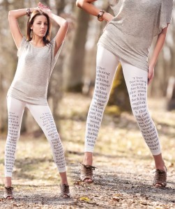 [Für meine blinden Leser: Die Frau trägt eine helle Legging, auf die in schwarzer Schrift gedruckt ist “The f*cking thing I f*cking like in the f*cking english language is that you can f*cking put the f*cking word “f*cking” in every f*cking place you f*cking want.” Hihi!]