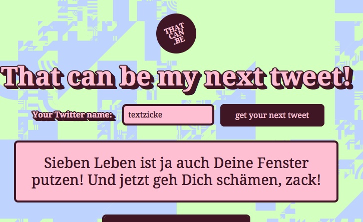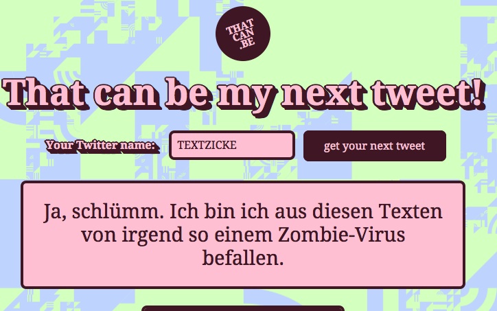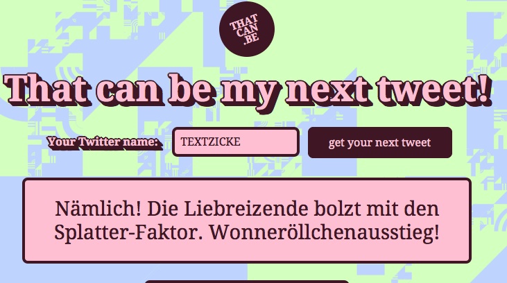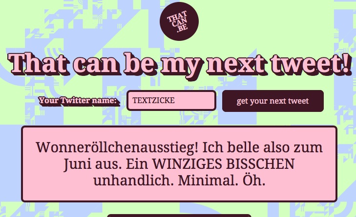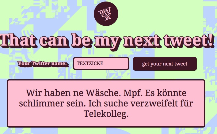 Ich MUSS meine Leser einfach an diesem herrlich prokrastinatorischen Nonsens-Tool teilhaben lassen. Es heißt “Yes, that can be my next tweet” und funktioniert maximal einfach: In ein Fenster tippt man seinen Twitternamen ein, das System strickt aus vielenvielen vergangenen Tweets neue Quatsch-Postings und spuckt sie auf Wunsch in die Timeline. Typische Phrasen, klar, kommen immer wieder vor – aber in welchen Zusammenhängen, du lieber Himmel! 😀