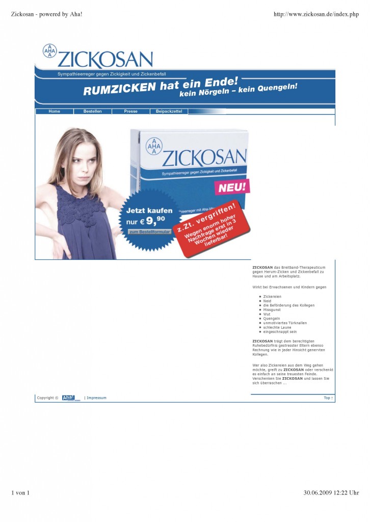 Via Twitter (um genau zu sein, über meinen geschätzten Verfolgten “pix4pix”) erreichte mich eine – äh – interessante Anzeige. Ich leide seitdem unter noch größerem Verfolgungswahn als sonst und hoffe, dass mir jetzt nicht tonnenweise Zickosan-Packungen als Scherz geschickt werden: 😉